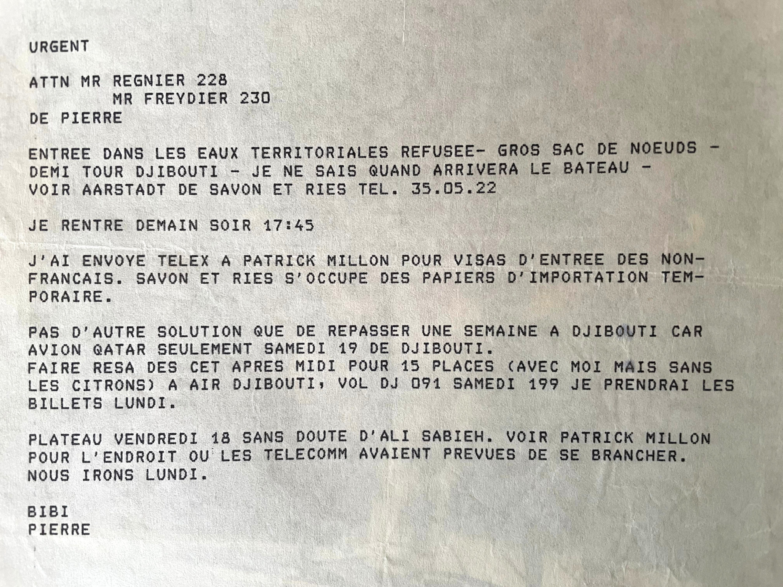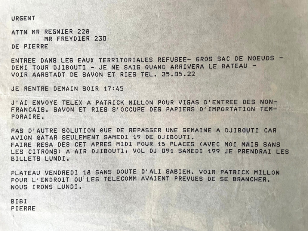 La nouvelle se répand très vite sur le bateau, avec les conséquences à prévoir : un troisième plateau à organiser en catastrophe à Djibouti, de nouveaux sujets à tourner, une « bretelle » à opérer directement sur le Qatar, sans doute par avion, réserver des places, acheter des malles et faire… une prière pour que cela passe !