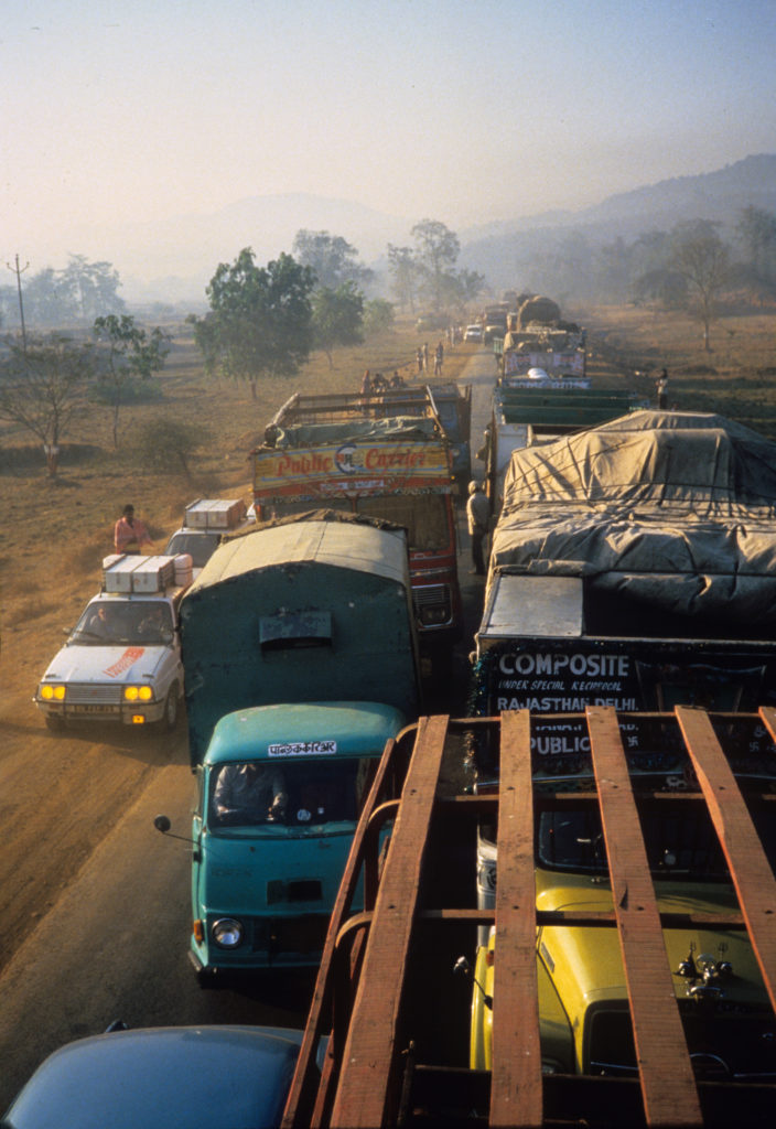 Après la sortie interminable de Bombay, les problèmes commencent. Devant nous des camions; à droite et en face, des camions. Sur les bas-côtés, des camions. Au milieu, des camions. Pas une seule place pour s’y faufiler ! Ils doivent être là depuis des heures ! Pas un signe d’énervement. Pas un mouvement de mauvaise humeur. Pas un mot plus haut que l’autre.