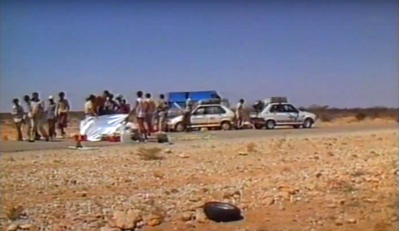 – Kilomètre 100 : nouvel arrêt. La Land fume de tous les côtés. Les militaires en sortent, affolés. Radiateur cassé. Une heure perdue.