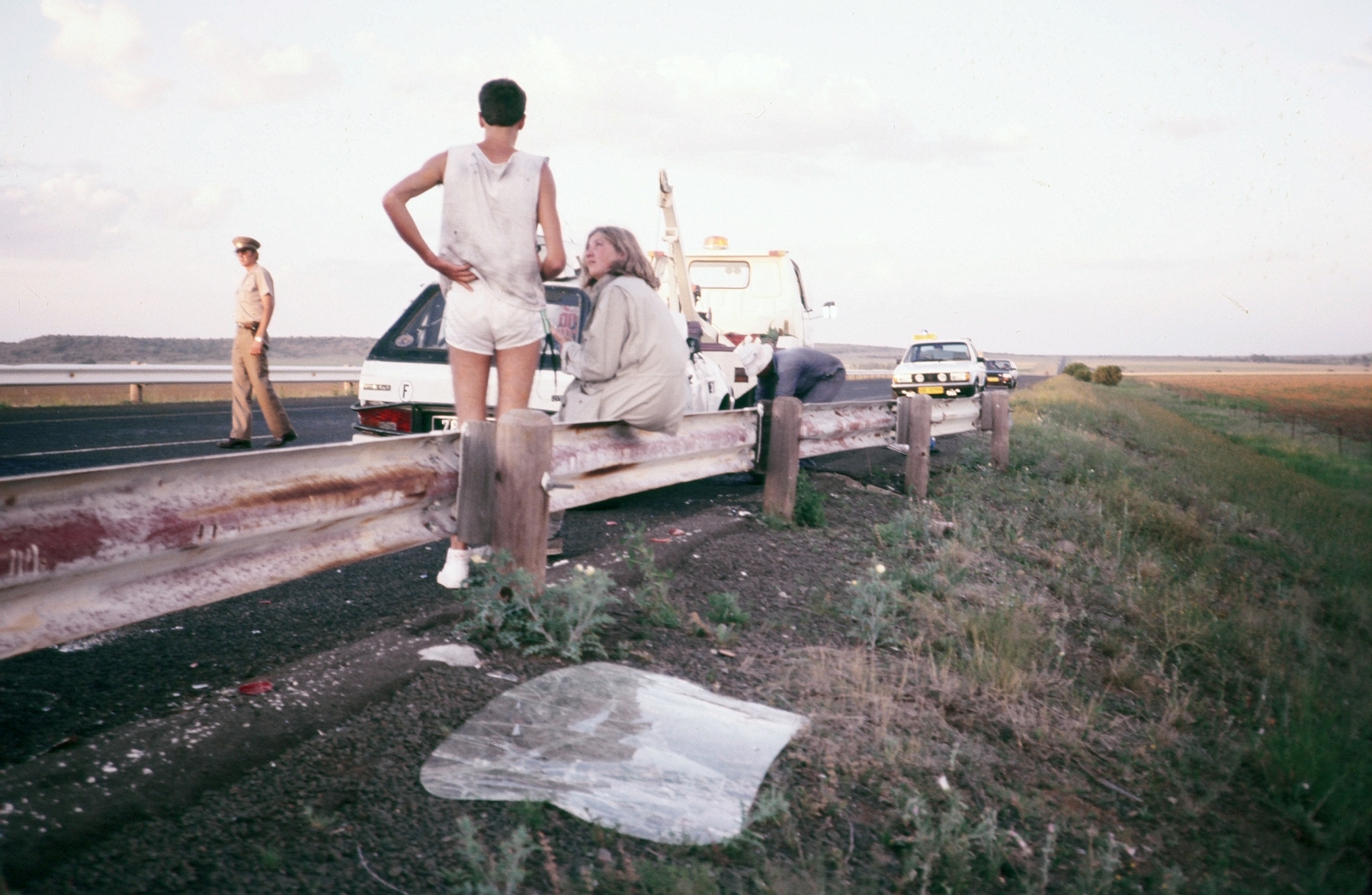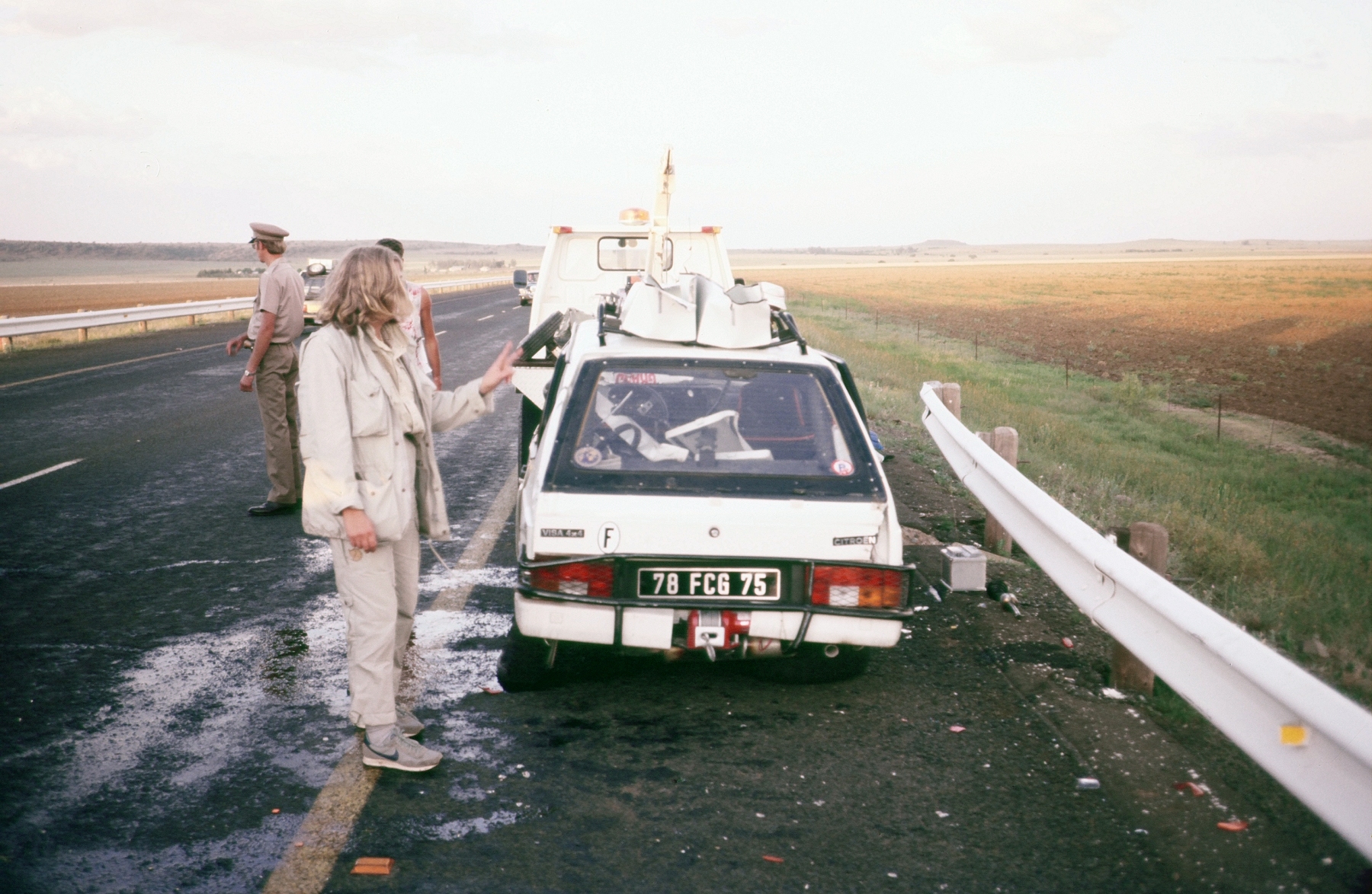 Immédiatement, Jean-Pierre va fouiller dans le coffre de sa voiture, en extrait un cric, un marteau et quelques clefs. Il tape et redresse dans tous les sens, sous les yeux étonnés des occupants de l’autre épave. Mais lorsque Benoît, consciencieux jusque dans la détresse, sort un groupe électrogène, déroule un câble, branche une torche électrique de mille watts, hisse sa caméra sur l’épaule et commence à filmer la réparation, les Sud-Africains ne comprennent plus rien ! Ils ouvrent de grands yeux, en avant l’air de se demander en face de qui ils se trouvent, et si tout cela n’est pas une mise en scène dont ils seraient les malheureux héros !