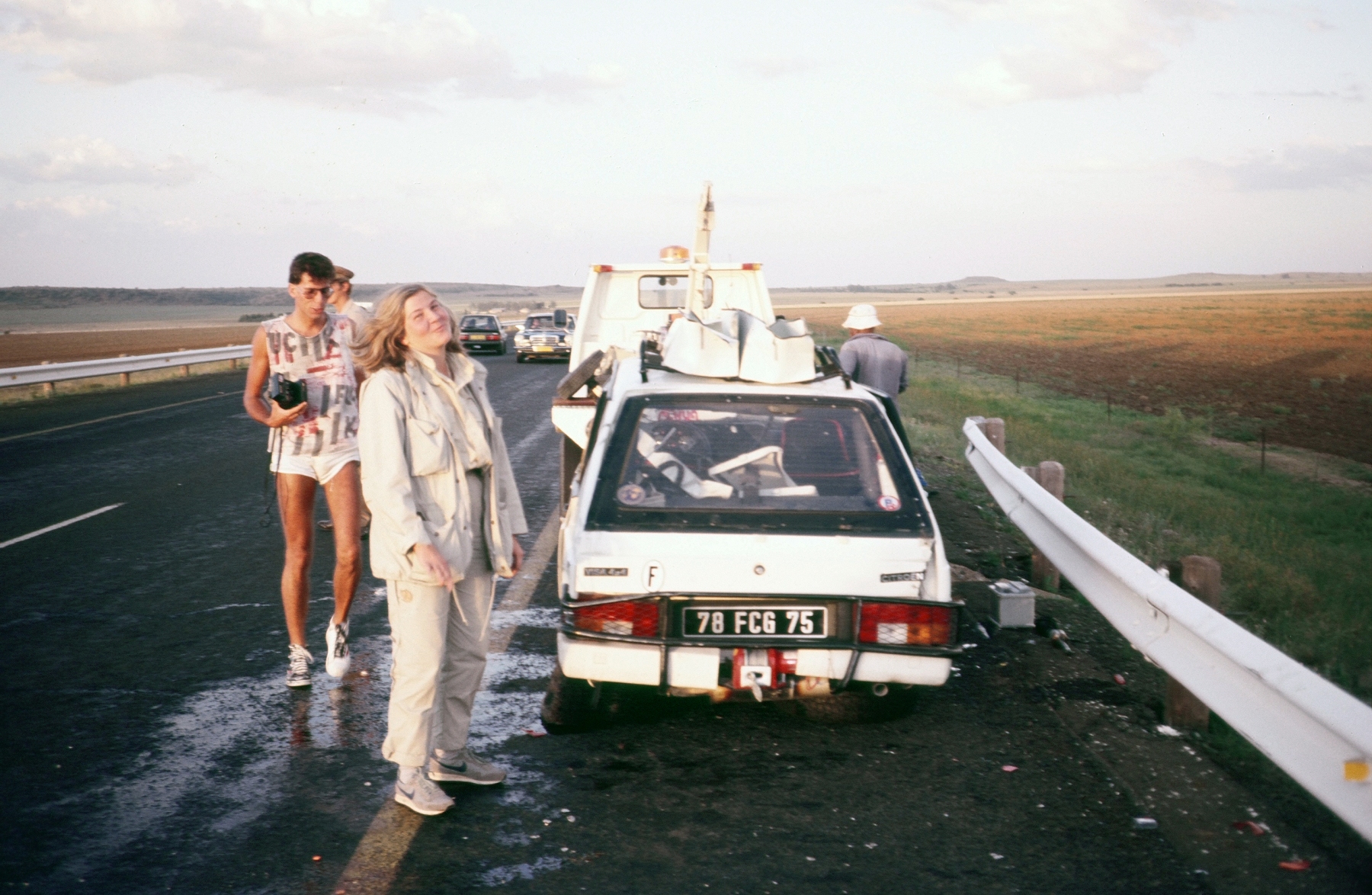 Nous voilà lancées dans l’aventure par la grande porte. Au moins c’est fait ! On commence aussi à comprendre à la fois les contraintes énormes d’un programme télé. Les contraintes et les moyens mis à notre disposition quand les deux nouvelles voitures arrivent par avion cargo. Pas une voiture mais 2 voitures, car l’émission passe sous silence le deuxième accident qui a marqué cette première semaine de course. La voiture de production s’est elle aussi offert un looping en Afrique du Sud. Je crois d’ailleurs que c’est ce qui nous a épargné le retour au bercail immédiat. Nous sommes sauvées par l’accident de Didier Régnier. Merci, Didier, tu es un super reporter et tu nous sauves la mise. Finalement c’est tout ce qui compte.
