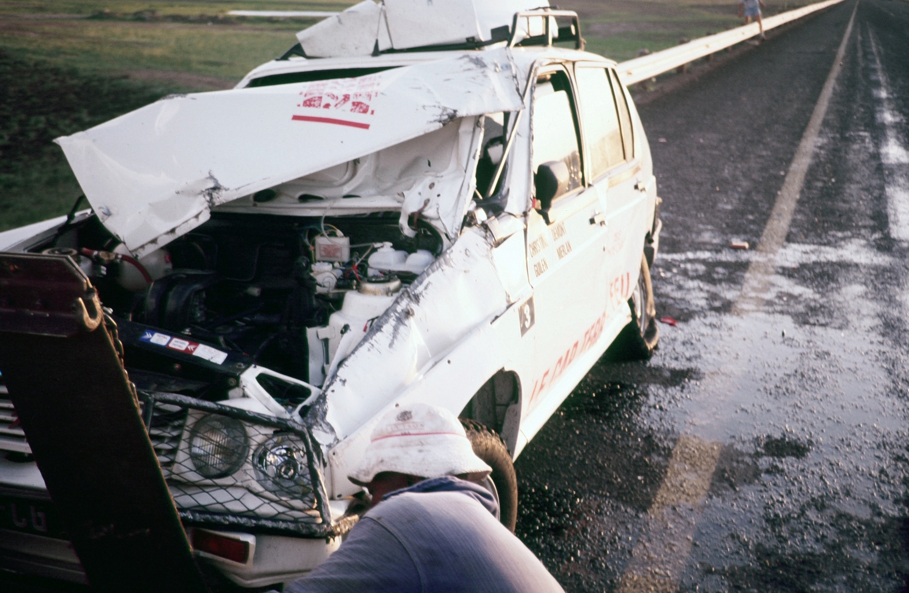 Gauthier prend des photos, Jean-Pierre cogne, Benoît tourne et moi, je réapprends à marcher. La voiture est hors d’usage. Châssis écrasé. Caisse morte. Les mots tombent comme autant de couperets. A l’emplacement des pédales, il n’y a plus que quelques centimètres de largeur. En bas, sur le plancher, l’arceau de sécurité a été sectionné d’un coup. C’est lui et la ceinture qui m’ont sans doute sauvé…